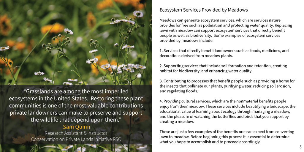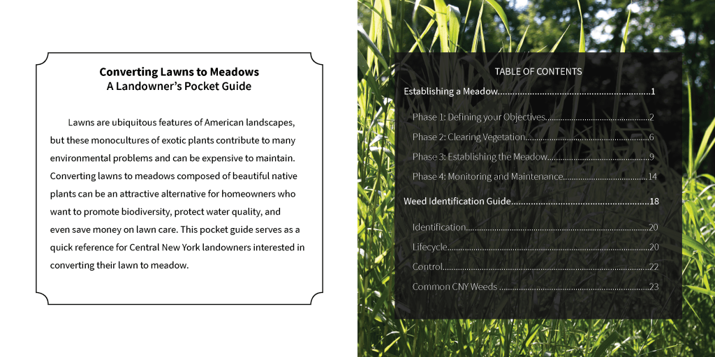 During a summer internship, worked with Restoration Science Center to develop a guide for landowners to convert lawns to meadows. All photographs, design, and content were created and collected by me, editing and support was provided by other RSC staff. More information can be found on their website here.